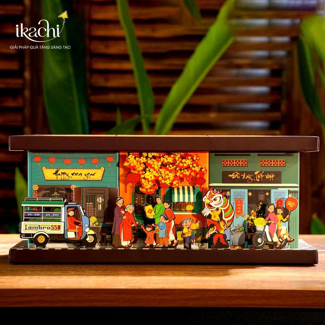 The Ikachi Green Tết Gift Box “Blessing You” beautifully recreates the scene of a vibrant Tết neighborhood, where yellow apricot blossoms, white chrysanthemums, green kumquat trees, red firecrackers, and colorful parallel sentences adorn every street and alley. Each detail recalls days of reunion filled with love, the warmth of family, and the close-knit bonds of neighborhood community fostered across generations.
