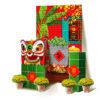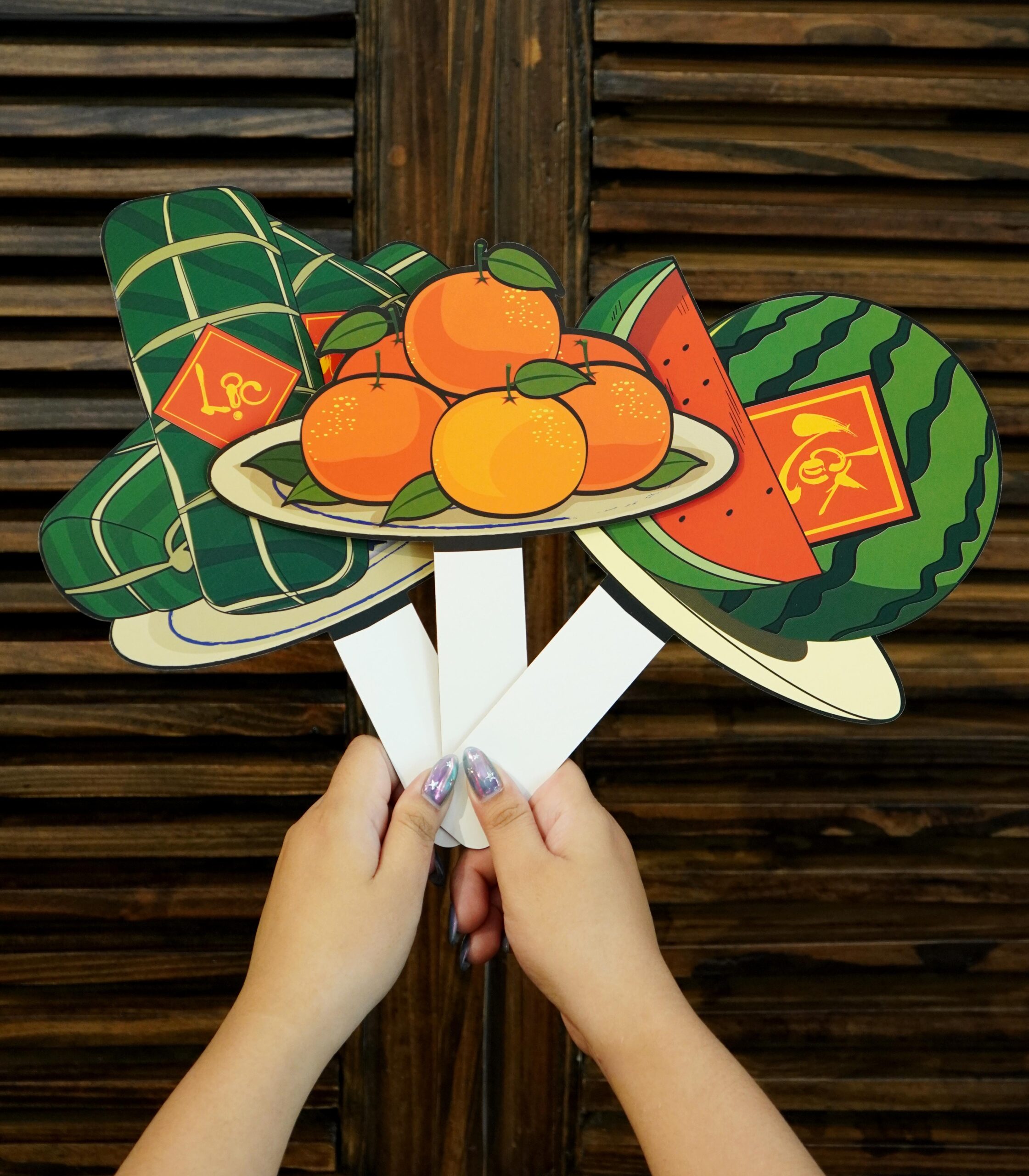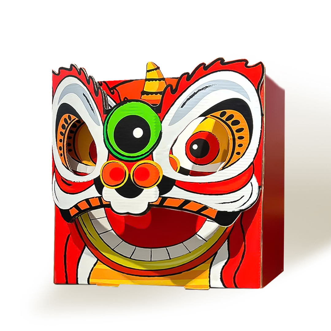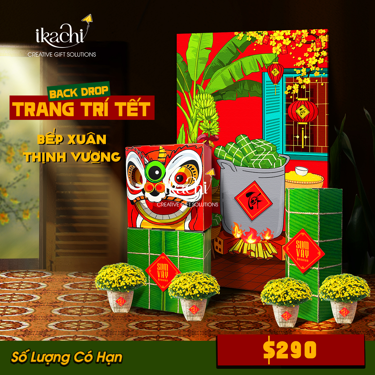 Tấm backdrop khổ lớn gợi hình ảnh gian bếp truyền thống ngày cuối năm – nơi cả nhà quây quần gói bánh, trò chuyện, chờ khoảnh khắc giao thừa. Bên cạnh là mô hình bánh chưng, bánh tét được tạo hình chắc chắn, mang ý nghĩa đất trời – âm dương hòa hợp, biểu trưng cho no đủ và bền lâu. Điểm nhấn đặc biệt là mô hình đầu lân, đại diện cho sinh khí mới, sự hân hoan và khởi đầu thịnh vượng trong năm mới.