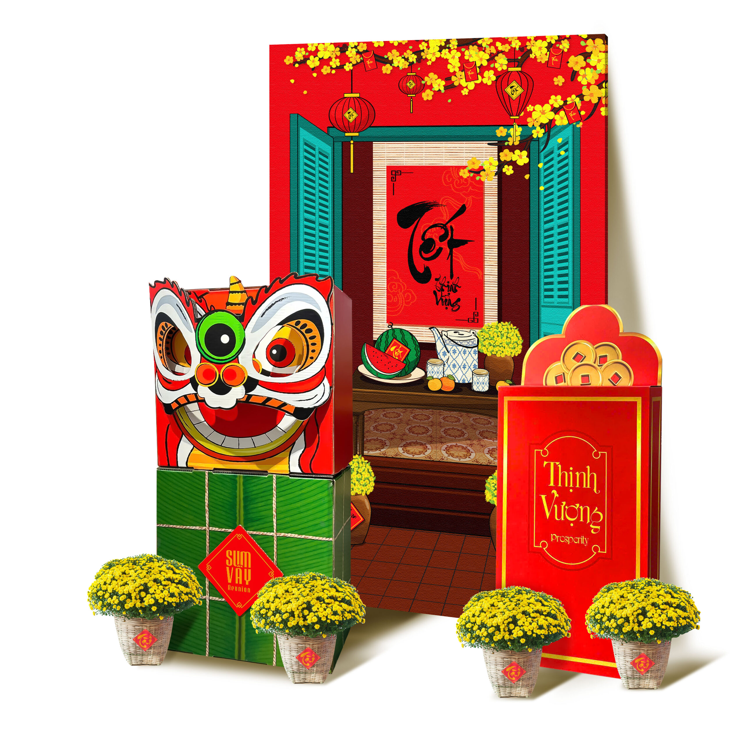 Backdrop mở ra khung cảnh Tết giản dị nhưng ấm áp. Bánh chưng tượng trưng cho sự vẹn toàn, gắn kết. Đầu lân xuất hiện không mang sắc thái lễ hội sôi động, mà như một linh vật canh cửa, mang ý nghĩa trấn an – bảo hộ – đón điều lành. Bao lì xì là lời chúc nhỏ nhưng chân thành: chúc một năm mới yên vui, thuận hòa.