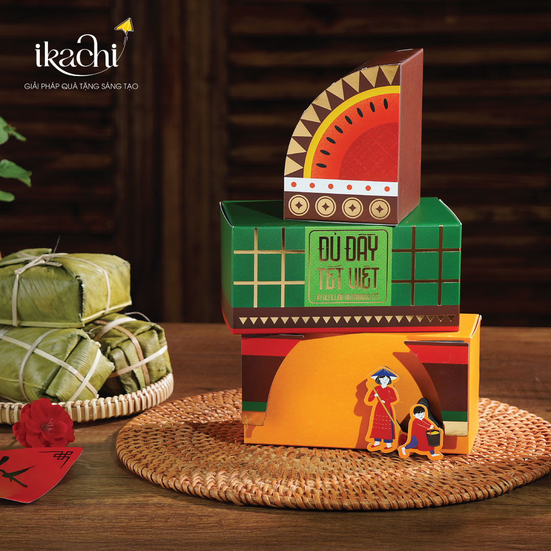 Bánh chưng xanh tượng trưng cho đất trời bình yên, dưa hấu đỏ mang đến may mắn cát tường, hay đồng tiền vàng cầu mong tài lộc ấm no cùng những họa tiết lấy cảm hứng từ hoa văn trống đồng, một nét chấm phá mang đậm bản sắc tinh hoa nước Việt.